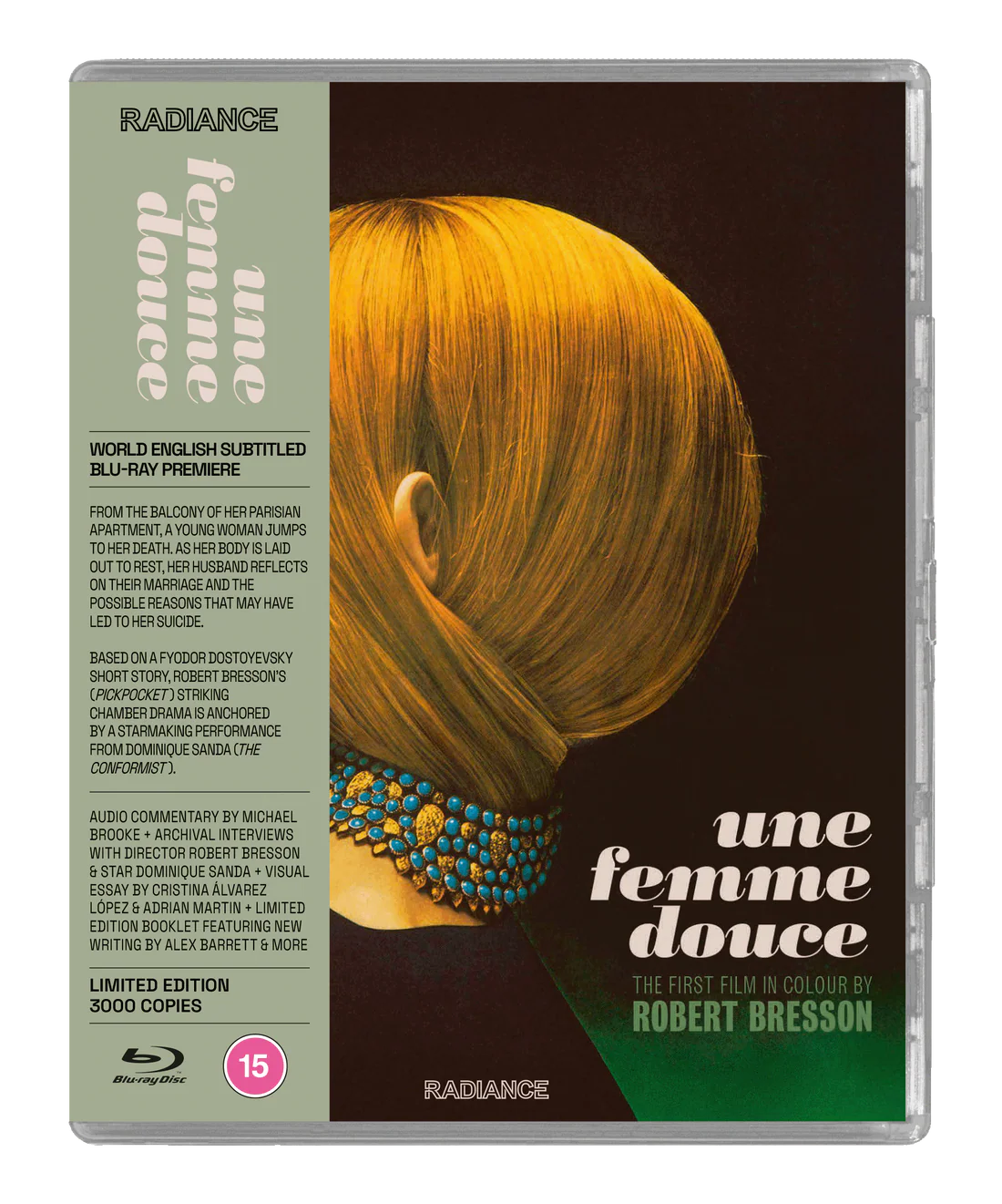 Radiance Films has released Une Femme Douce (A Gentle Woman, 1969) on Blu-ray in a limited edition of 3,000 copies. Extras include a new audio commentary by Michael Brooke, a visual essay by Cristina Álvarez López and Adrian Martin, an archival interview with Robert Bresson, and additional materials.